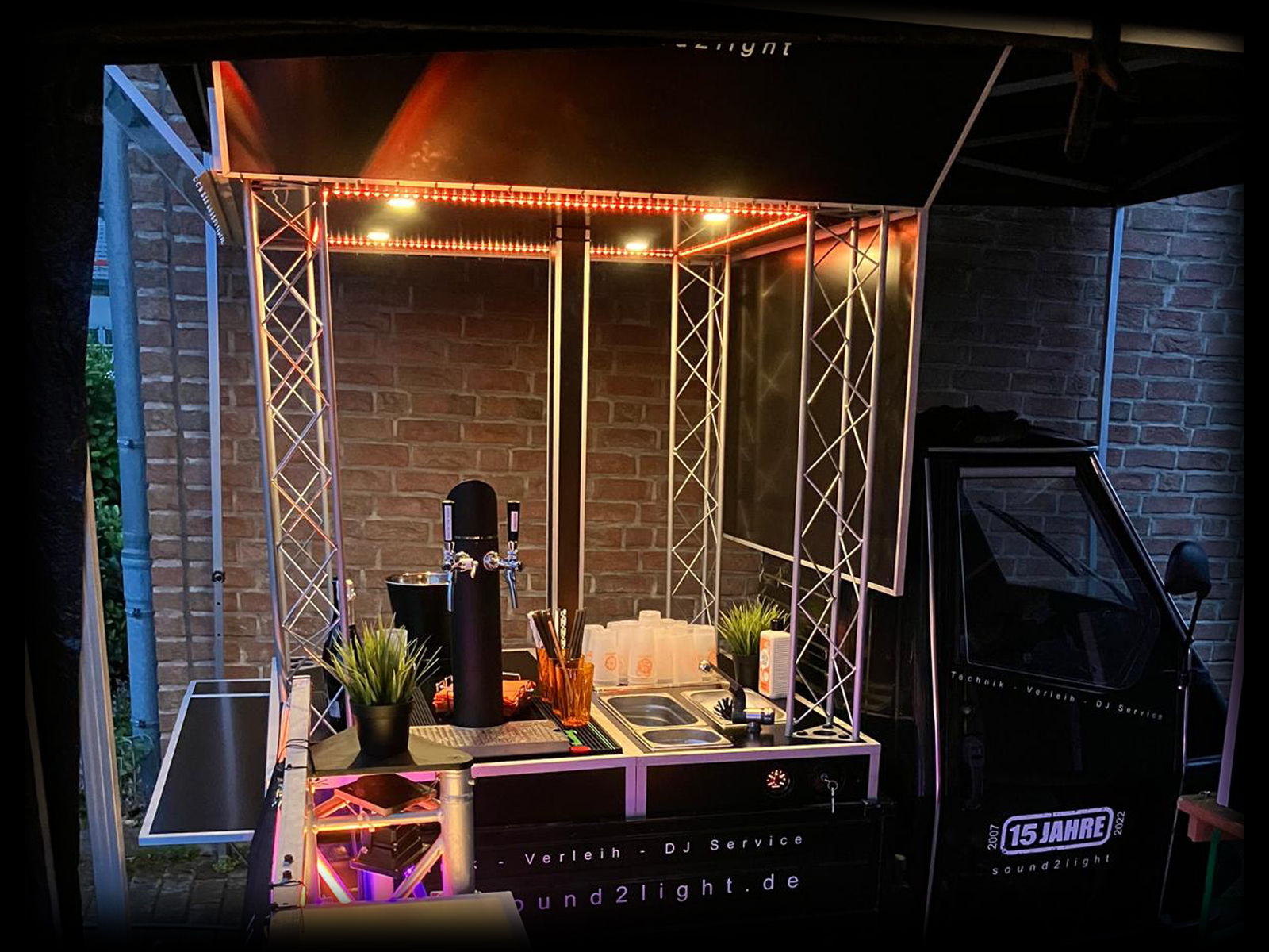 Mit unserer umgebauten Piaggio Ape kommen wir mit integrierter Zapfsäule und Spüleinheit direkt zu Eurem Wunschort.